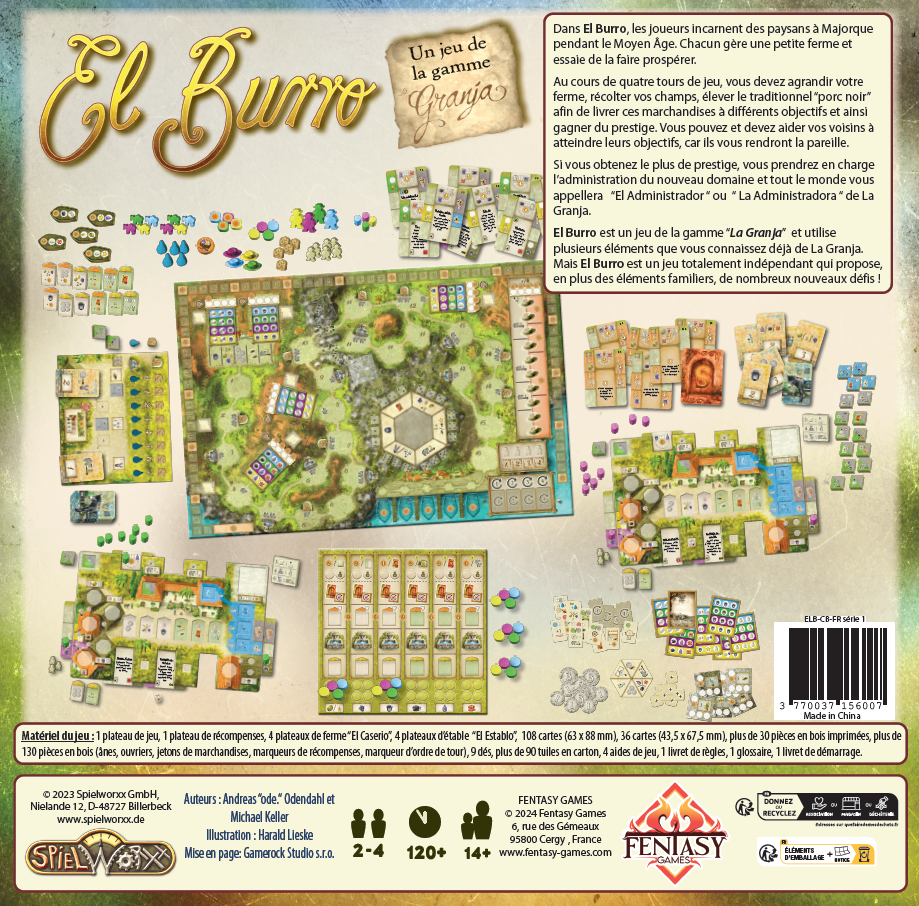 In El Burro, you are developing a farm in Majorca and have to move your goods from your farm to the port of Palma. The game uses multi-purpose cards and dice-drafting as in La Granja, while also containing other elements such as donkey cards, donkey deliveries, and a solo game. You need to manipulate your farm in the best way possible while making maximum use of your cards and the dice.
