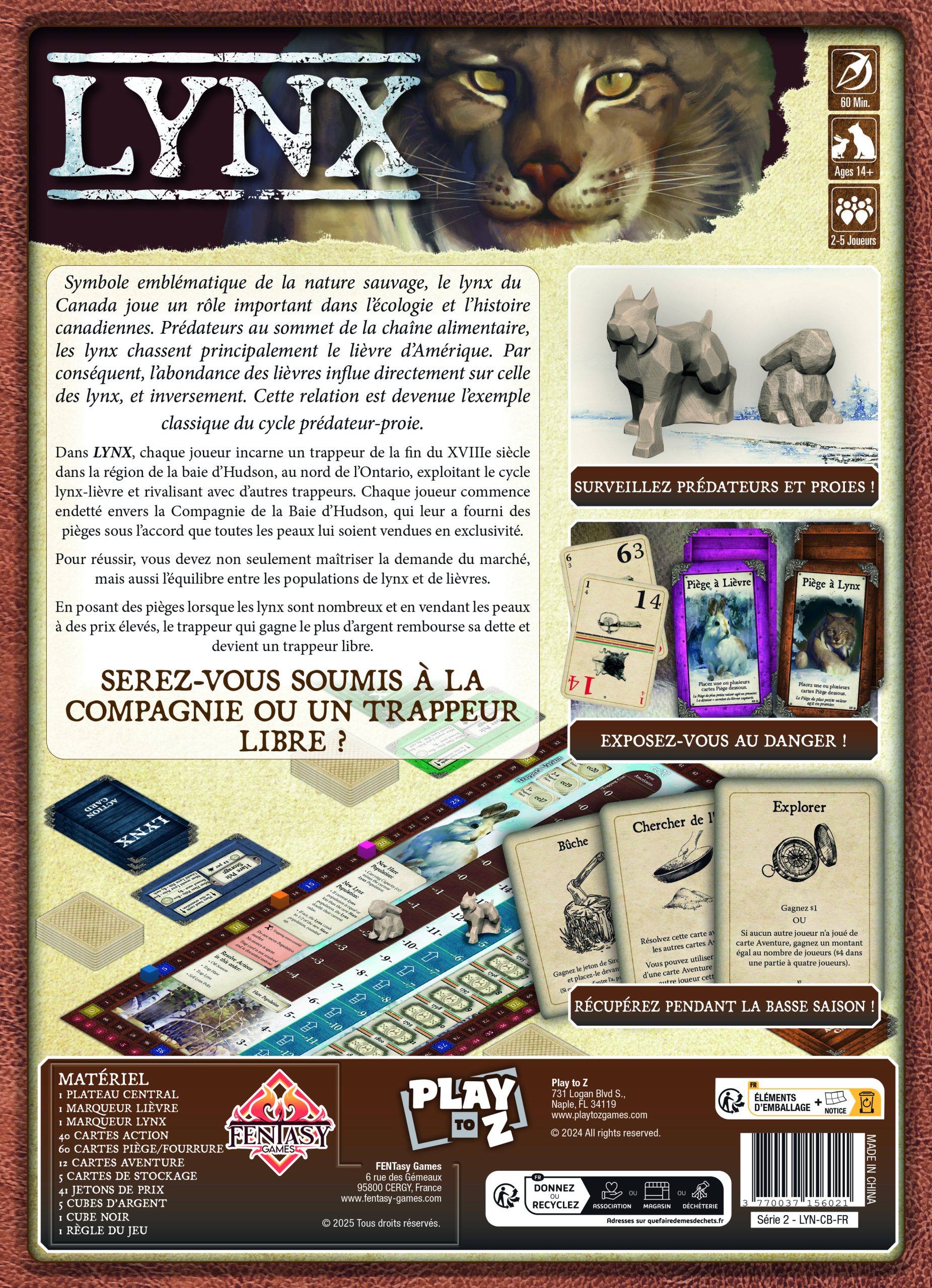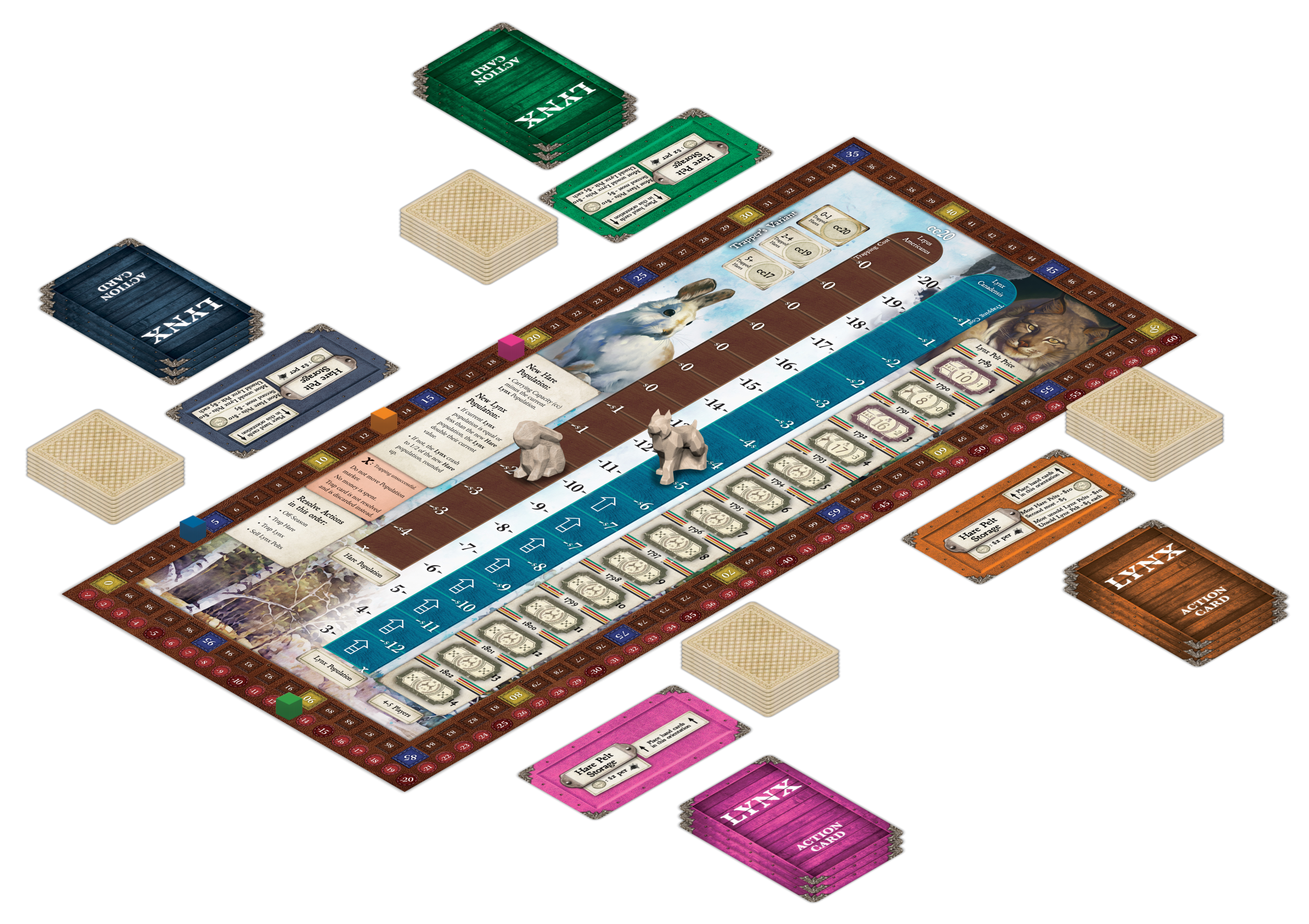 In Lynx, an economic game with a historical and ecological theme, each player takes on the role of a late 18th century fur trapper in the Hudson’s Bay region of northern Ontario who is exploiting the lynx-hare cycle and trying to outwit other trappers.